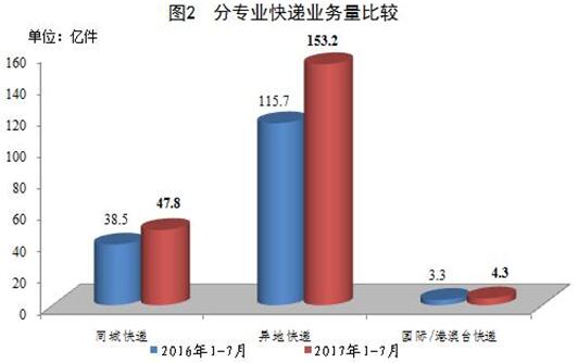 1-7月,同城、异地、国际/港澳台快递业务量分别占全部快递业务量的23.3%、74.6%和2.1%;业务收入分别占全部快递收入的14.4%、51%和10.9%。与去年同期相比,同城快递业务量的比重下降1.1个百分点,异地快递业务量的比重上升1.1个百分点,国际/港澳台业务量的比重基本持平。