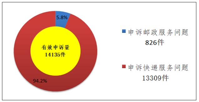 受理的申诉中有效申诉(确定企业责任的)为14135件,比上年同期增长17.2%。有效申诉中涉及邮政服务问题的826件,占有效申诉量的5.8%;涉及快递服务问题的13309件,占有效申诉量的94.2%。