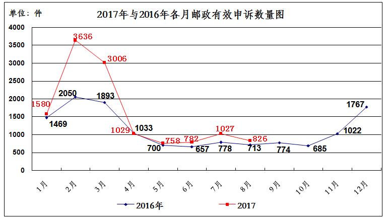 二、邮政服务申诉情况 2017年8月,消费者关于邮政服务问题的有效申诉826件,环比下降19.6%,同比增长15.8%。