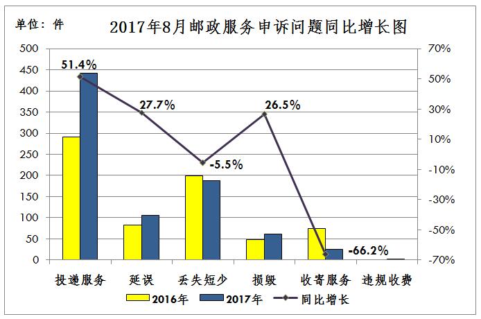 2017年8月,消费者申诉邮政服务的主要问题是投递服务,占申诉总量的53.5%。