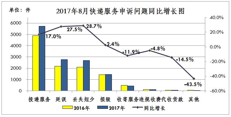 2017年8月,消费者对邮政服务申诉的主要问题与上月相比有所下降。与去年同期相比,邮政服务主要问题增长的有投递服务、邮件延误和邮件损毁,同比分别增长51.4%、27.7%和26.5%。 三、快递服务申诉情况 (一)消费者申诉的主要问题 2017年8月,消费者关于快递服务的有效申诉13309件,环比下降9.5%,同比增长17.3%。