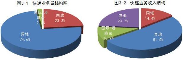 1-7月,同城、异地、国际/港澳台快递业务量分别占全部快递业务量的23.3%、74.6%和2.1%;业务收入分别占全部快递收入的14.4%、51%和10.9%。与去年同期相比,同城快递业务量的比重下降1.1个百分点,异地快递业务量的比重上升1.1个百分点,国际/港澳台业务量的比重基本持平。