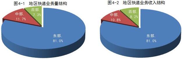 1-7月,东、中、西部地区快递业务量比重分别为81%、11.7%和7.3%,业务收入比重分别为81%、10.8%和8.2%。与去年同期相比,东部地区快递业务量比重下降了0.2个百分点,快递业务收入比重下降了0.2个百分点;中部地区快递业务量比重下降了0.1个百分点,快递业务收入比重上升了0.1个百分点;西部地区快递业务量比重上升了0.3个百分点,快递业务收入比重上升了0.1个百分点。