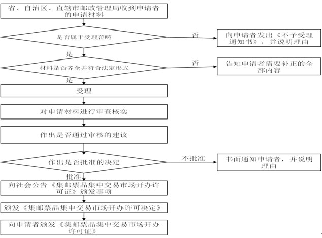1.办理机构:省级邮政管理机构 2.办理依据:《集邮市场管理办法》 3.审核内容: 申请集邮票品集中交易市场开办许可,应当符合《集邮市场管理办法》第十二条的规定。具体内容包括以下方面: (1)符合企业法人条件; (2)注册资本不低于人民币三十万元; (3)有适合集邮票品交易的固定经营场所; (4)具备识别邮资凭证真伪的人员和设备; (5)有集邮票品集中交易市场管理制度。 集邮票品交易的固定经营场所应符合国务院邮政管理部门及公安等管理部门依法履行职责的要求。 4.申请材料
